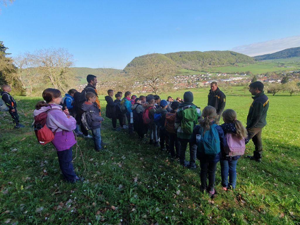 Am Waldrand angekommen begrüßten die beiden Förster Herr Elsenhans und Herr Dreher die Klassen und führten sie weiter in den Wald hinein. Auf spielerische Weise brachten die beiden Förster den Kindern wichtige Inhalte des Ökosystems Wald nahe.