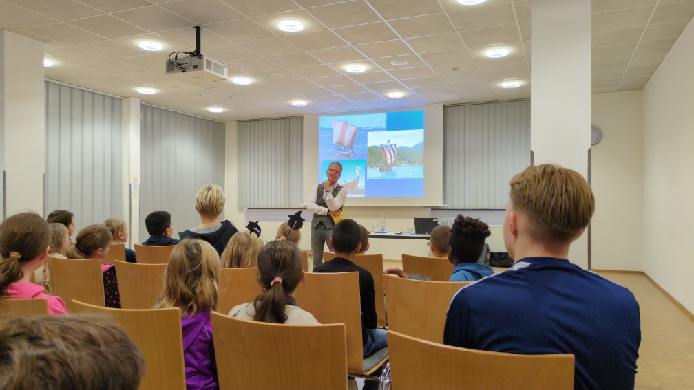 Am Donnerstag, den 23.10.2025 erlebten die Klassen 2 und 3 der Grundschule Deggingen eine spannende Autorenlesung mit dem Autor Fabian Lenk. Passend zur landesweiten Frederickwoche, die Kindern Lust auf Lesen machen soll, stellte uns der Autor seinen Kinderbuchklassiker „Das schwarze Drachenboot“ vor. Gespannt lauschten die Kinder der Geschichte des Wikingerjungen Tjark, aus der uns Herr Lenk einige Passagen vorlas. Ganz im Stile eines „Cliffhangers“ stoppte er seine Lesung an der spannendsten Stelle. Jetzt ist es an den Kindern, sich das Buch beispielsweise in der örtlichen Bücherei auszuleihen und selbst zu erlesen, wie sich Tjark aus seiner brenzligen Situation befreien kann.